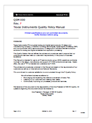 The Quality System Manual (QSM), also known as QSM000, accompanies the Quality System and defines policies and procedures used to assure our products and services meet our customers’ requirements, along with International and national standards. The QSM documents work instructions and process flows for specific activities needed to implement the quality management system and quality policy in pursuit of benchmark quality and reliability, and business excellence. It is used across TI by all who are involved in the design, manufacturing and support of TI semiconductor products and services.